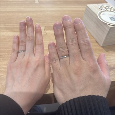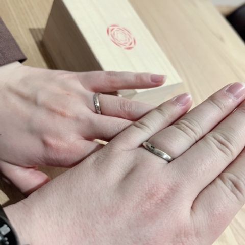 夫、ヘアラインの入ったモデルと妻、ダイヤモンドのラインで形成した指輪を作りました。打ち付けやプラチナリングの製法まで選べて、とても満足のいく出来でした。 シンプルに、自分たちらしさをオーダーメイドできる一生のパートナーをこちらでお願い出来て良かったです。