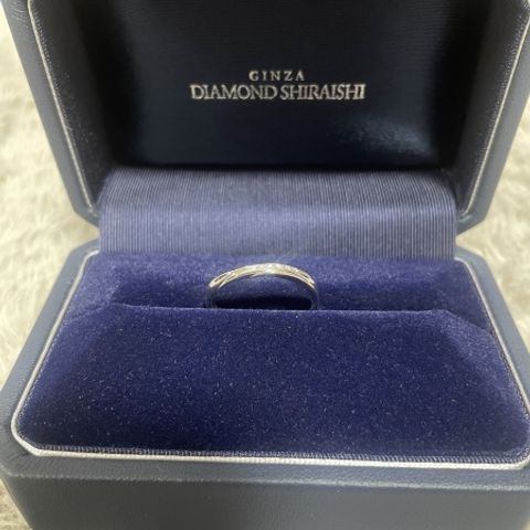 細身で華奢なデザインなのと、緩やかなV字の形が婚約指輪と重ね付けにもピッタリでとても気に入っています。旦那の方の指輪はマット加工がされていて、既製品にはなかったデザインでしたが、スタッフの方が提案してくださって、そのデザインに決めました。