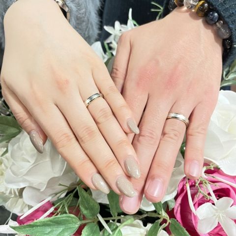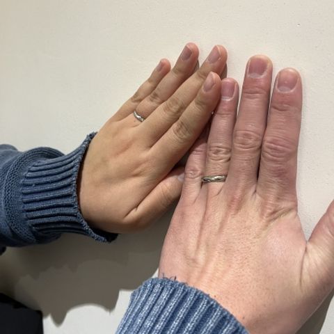 自分たちが好きなデザインを店員さんと相談しながら決められたので、自分たちらしさやつけ心地など、満足しています。重ね付けすることを想定して作ったので、重ね付けしたときの見た目も気に入っています。飽きが来ないデザインにしたので、一生物としてとても良い指輪が出来て満足しています。