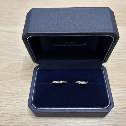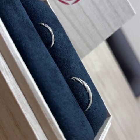 少し個性的なデザインなのが気に入りました。 2人のデザインはほぼ同じなのですが、女性用の方は真ん中に宝石があしらわれていて綺麗です。また、互い違いに加工が可能で、お揃いだけどお揃いじゃないデザインが出来るのも良かったです。 よく御祝儀で使われる水引をイメージして作られたデザインで、末永く結ばれる、という意味が込められているところもとても良いなと思いました。