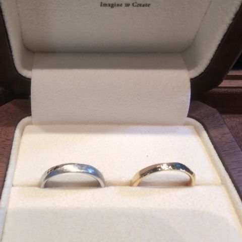 2人の指輪を「槌目加工」と「斜め削り」でお揃いにした上で、女性側を映える色合い、男性側をアイスマットにしたことで、ベースは同じでもお互いに個性のある指輪を作ることができた。槌目加工による光の反射が想像以上に綺麗で、気に入っている。