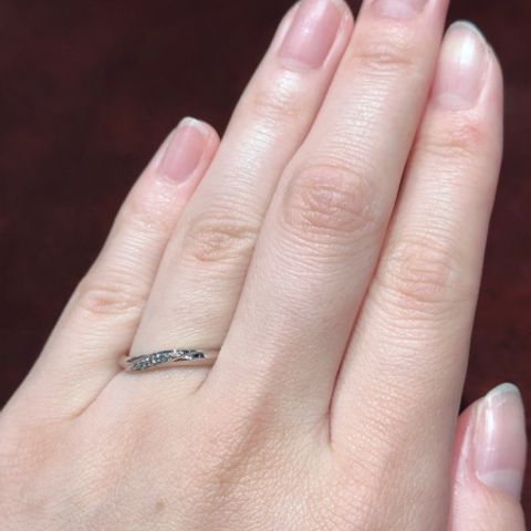 お互い毎日着用する予定でしたので、ダイヤなしを探しておりました。 シンプルなデザインを希望しておりましたが、 お互い少しウェーブが入っているのがいいね、とのことで、こちらを試着。 試着してみるとお互いの手にピッタリだったので購入しました。