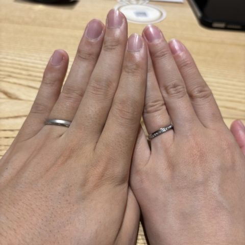 事前にお試しの指輪を作ってもらい、それを実際に身につけて生活することで、着け心地やサイズ感を確認してから、結婚指輪を作っていただけました。 完成した結婚指輪は自分たちにピッタリで、まったく違和感なく着けることができています。
