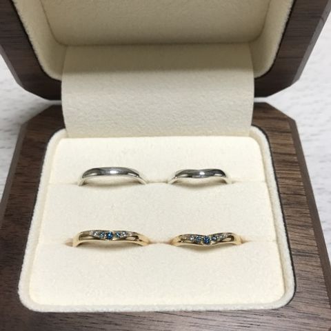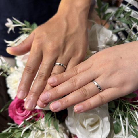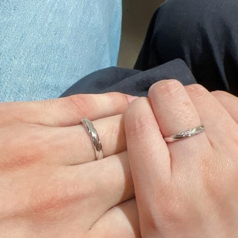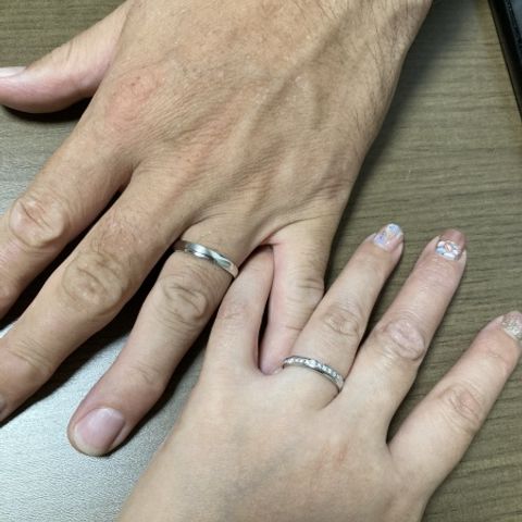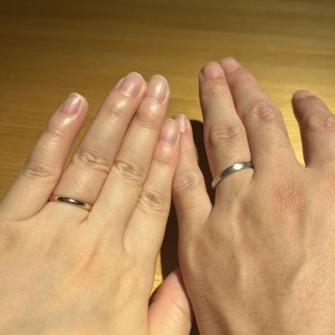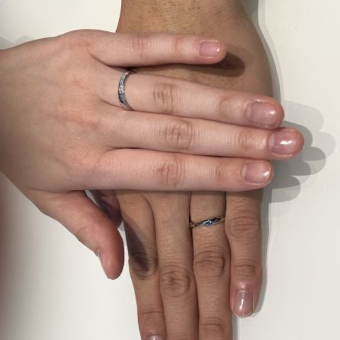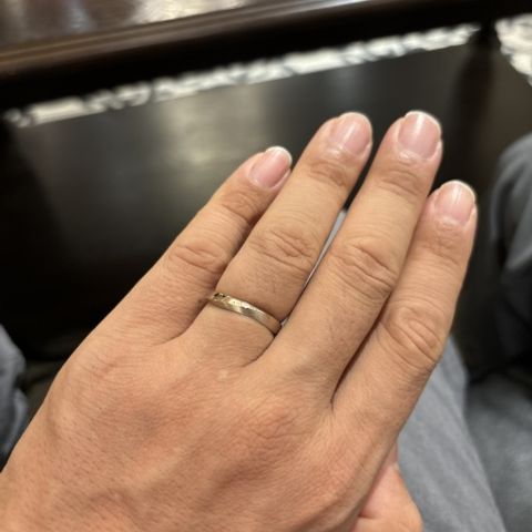 好みのデザインや素材を選んで、自分らしさを取り入れることができた。仕事柄派手なデザインは選べなくても、自分の肌の色や指の太さにあわせて、いつでも着けていたくなるような指輪になっている。2人で素材を揃えると、異なるデザインでも一体感があって良い。
