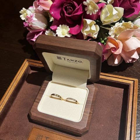 わたしたちは、既製品よりオーダーして指輪を作りたいと思っていました。面取り加工により、指輪に奥行き、オリジナル感を出しました。妻の指輪にはワンポイントでダイヤモンドをいれ、肌馴染みの良いシャンパンゴールドにしました。