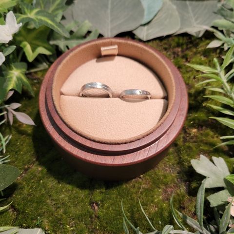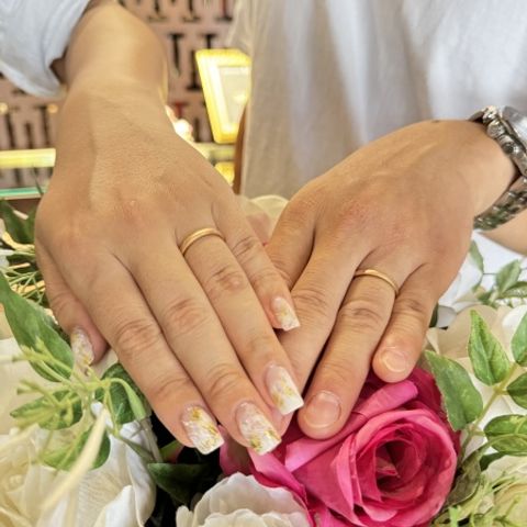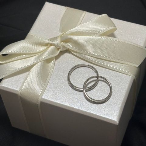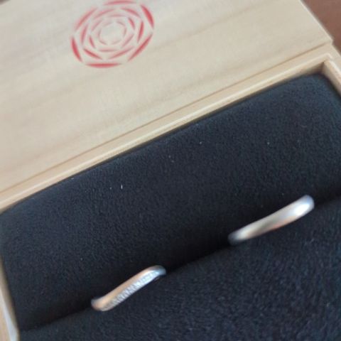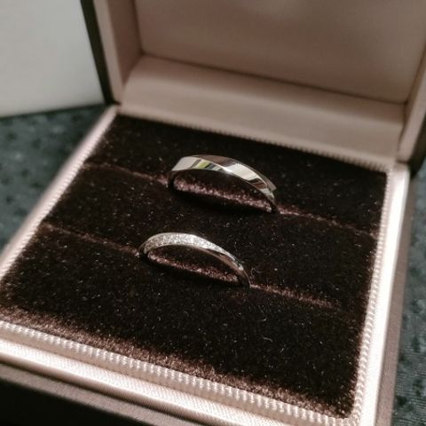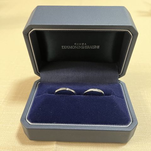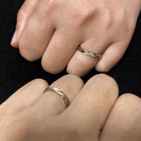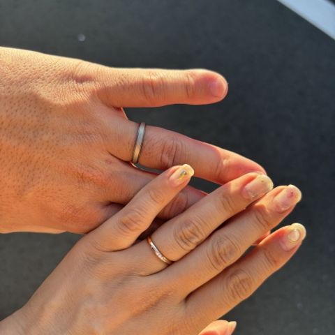 2人ともアクティブで、とにかく気にしすぎず毎日着けられる丈夫さと着け心地がベースにあったらいいなと思っていたので、安心感のある丈夫さに加えて思った通りのデザインに仕上げていただき、最高でした。2人の肌に馴染みもよく、つけた瞬間から自然でした。 夫は艶消しのみ、私は両サイドにミル打ちを施していただき、お揃い感と煌めきどちらもあります。