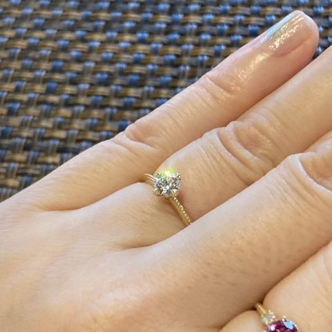 ソリテールリングの美しさの極地だと思いました。普段からアンティーク調や個性的なものしか着けないので、婚約指輪を選び始めたときに、世間の大半のデザインは興味を惹かれるものではなかったのですが、ケイウノさんでこちらに出会えて本当に良かったです。シンプルな形状なのに、爪のデザインとアームを裏面まで一周したミル打ちという凝ったディテールが、他のよくある立爪ソリテールとは一線を画した雰囲気を醸し出しています。横顔も美しく、華奢なようでいてしっかりした作りで安心感があります。