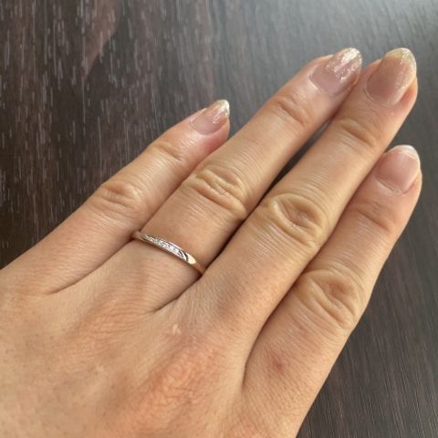 普段使い出来るようなデザインながらも華やかさもあり、つけていて気分が上がるような指輪だなと思いました。ダイヤモンドが複数付いていますが、極端に派手にもなっておらず、かといって控えめすぎることもなく、とても素敵なデザインです。