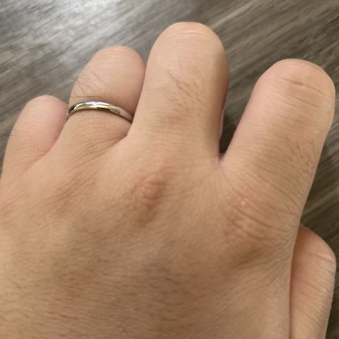 緩やかなカーブが指にフィットして着け心地が良いです。 日常生活でも違和感なく着けられそうです。 夫は普段全くアクセサリーを着けないので派手なデザインは苦手だと言っておりましたが、こちらのデザインはピンクゴールドのラインが入っているのにつや消しの加工がされており、華美になり過ぎないから着けやすいかもということでこのデザインに決まりました。