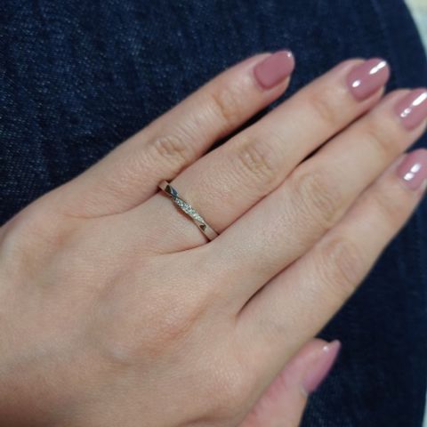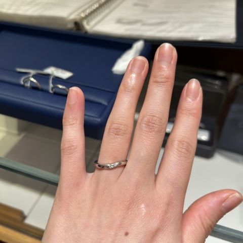 ウェーブデザインなので、柔らかい雰囲気で指も綺麗に見えます。 脇石も入っているので、シンプルながらも上品に光ってとっても可愛いです! 一生つけることを考えると、真ん中のダイヤモンドは小さすぎないのがいいと思っていましたが、大きさも幅広く選べて良かったです。