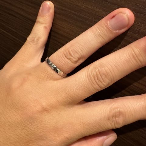 プラチナ999と純度が限り無く1000に近い純度で鍛造仕上げの丈夫さと、デザインが槌目模様で輝きが変化して好感があります。あまり指輪や貴金属はつけてこなかったけれど、他のデザインと比べても良いと思える物を選べて良かったです。