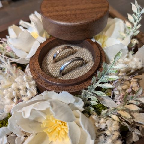 デザインは基本的にシンプルです。色はピンクゴールドを選びましたがとても肌に馴染む色でかわいいです。 仕上げにより艶を出すこともマットにすることも可能。石を埋め込んだり、特殊な加工をしたりといったオプションも選べます。 値段は選んだ素材代にもよりますが、既製品を購入するより安く抑えれた印象です。 あとは別売りですが木製のケースがとってもかわいくて気に入りました。 何より自分たちで作るので、思い出が残ります。
