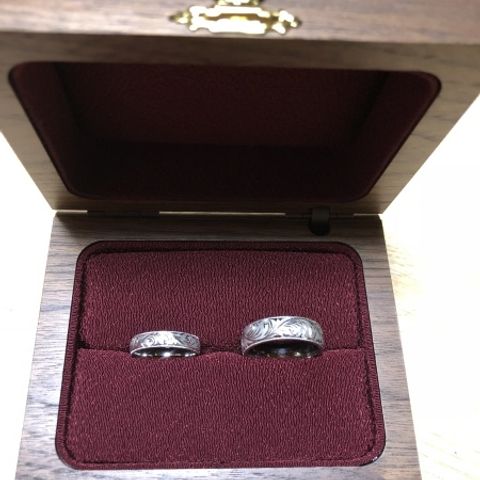 コーラルゴールドがとても素敵でした。S字に石が入っているデザインもお気に入りで、婚約指輪との重ね付けにもピッタリでした。夫のシルバーにシンプルな模様を入れたのもとても素敵で、かっこいい出来上がりになりました。大満足でした。一生大事にします。