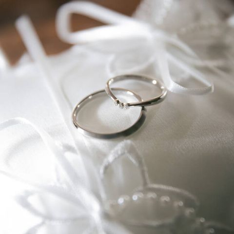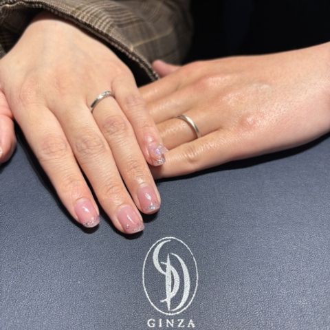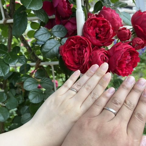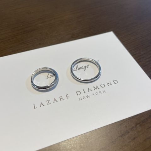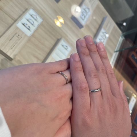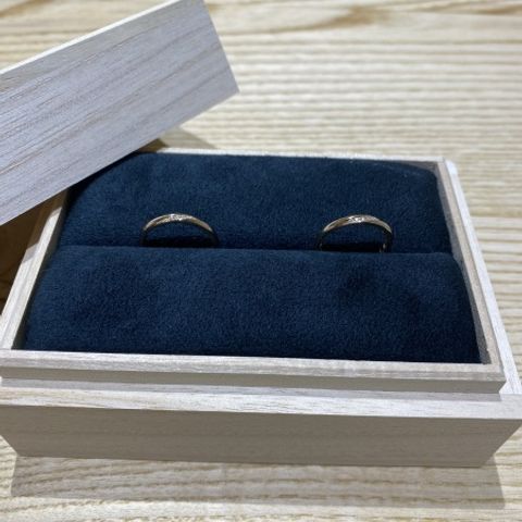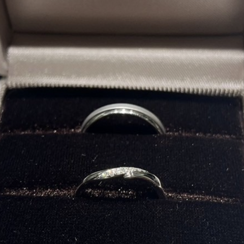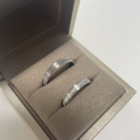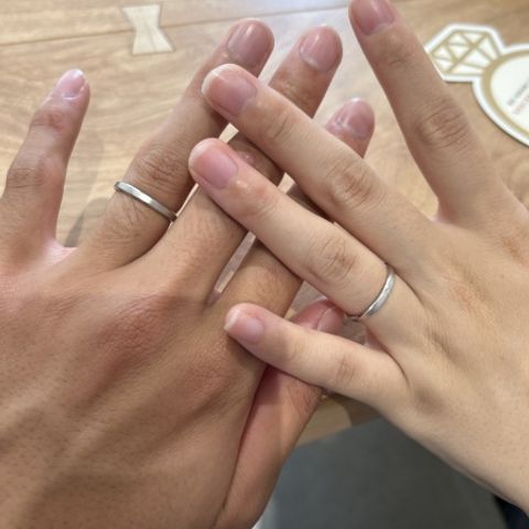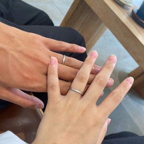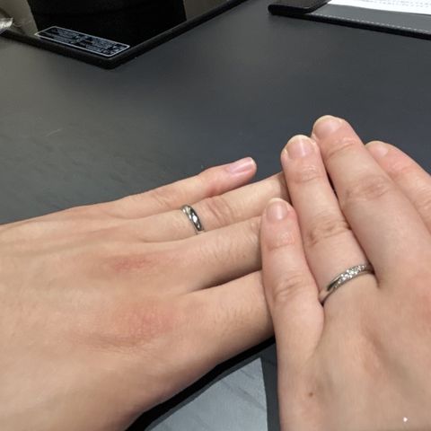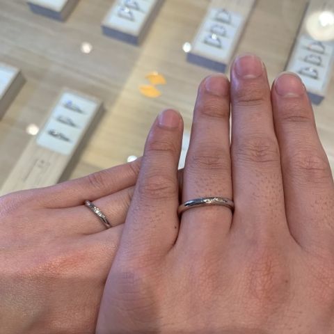 私はキラキラしすぎないけど少しポイントが欲しいという点、旦那はシンプルがいいという点で迷うことなく決まった指輪でした。 シンプルの中にもポイントがあるのが嬉しいです。 2人のイニシャルを入れようと思いましたが 文字数オーバーだったため、 そういう場合のパターンを教えていただき 私の指輪には旦那の名前、旦那の指輪には私の名前を刻印していただきました。