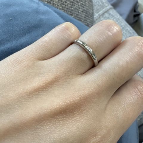 細いものを探しており、カーブしたものが良かったのですが、カーブしたものをいざつけてみると、あまり可愛くなく…店員さんがおすすめしてくださった、ちょっと変わった形のこの指輪、カーブではないですが、ダイヤがついていて少し下がった形がとても可愛かったです。