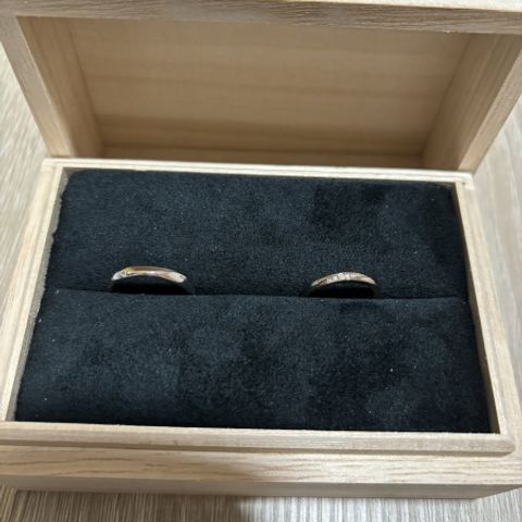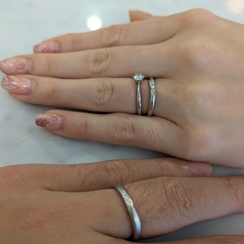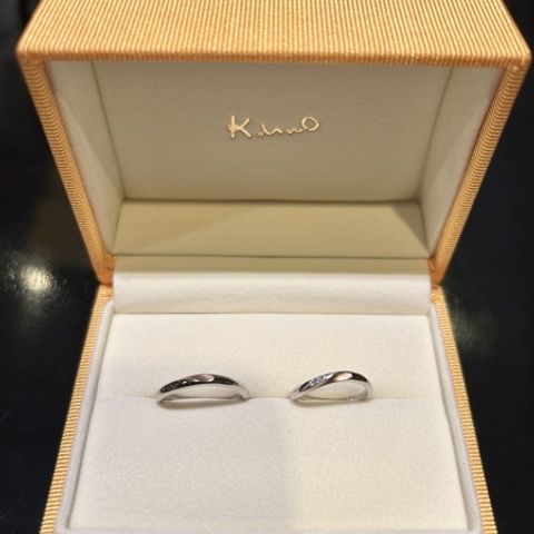 シンプルでこれから先ずっとつけていくのに飽きない。ウェーブ型で水かきが広い自分にもぴったりとしていて着け心地がいい。女性用は中央にダイヤがあり、男性用はマット加工を追加してかっこよく仕上げてもらいました。