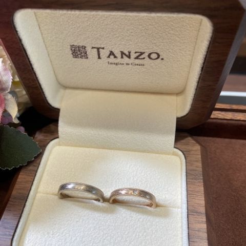 お互いアクセサリーを普段身につけないので、指輪のサイズやつけ心地、色味なども全く知らないまま選び始めたのですが、色々な店舗様を伺った結果、二人とも、甲丸の形に鏡面で荒めな槌目デザインをあしらったものがかわいいねという結論に至り、普段使いすることも考えて指輪の強度が抜群に良いTANZO様にデザインをお願いしました。 TANZO様オリジナルのコーラルゴールドが個人的にとてもお気に入りで、その色で作れたことを嬉しく思っています。