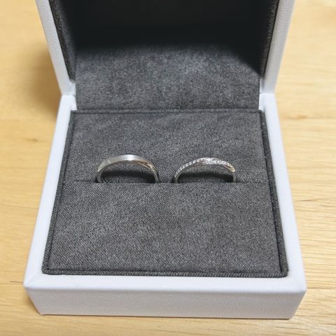 複数のデザイン・素材から選べ、オプション含めた組み合わせによって自分たちの拘りを表現することが出来る。 デザインも全体的にシンプルで、普段使いに適した作りになっていると思う。 指輪の号数も細かく指定できるので、自分の指にピッタリのサイズに作成できる。