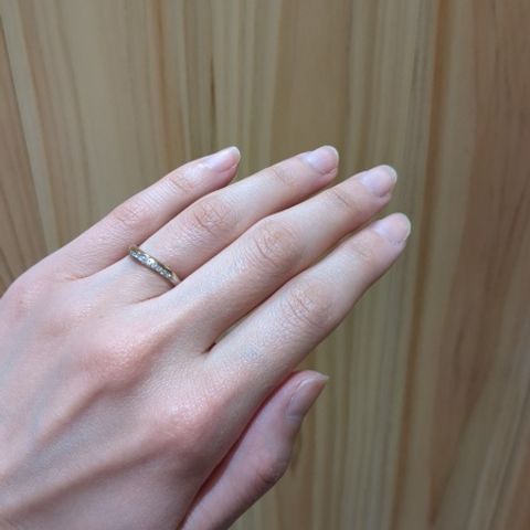 結婚指輪はハーフエタニティで探していました。 こちらのリングは鍛造製法で付けっぱなしOK。ダイヤのグレードもGカラーとVSクラスの保証があり、万が一ダイヤが外れた場合は無料で新しいダイヤをつけていただけます。アフターサービスが充実しており決め手となりました。