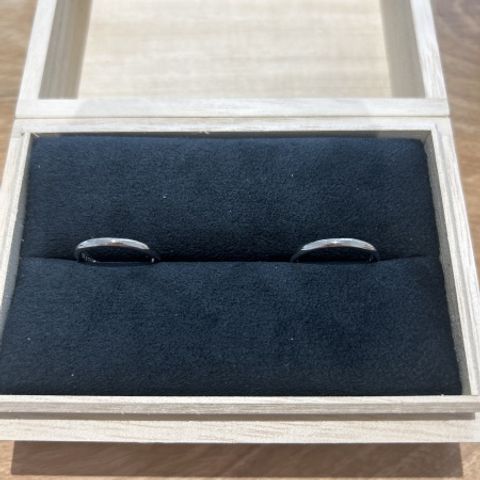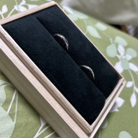 全体的にマットな加工をしていただき、落ち着いた印象にしました。ただ、指輪の表面の部分ななひねり加工を入れていただいたので、その部分だけキラッと輝き、 自分たちが欲しいと思っていたイメージにぴったりな指輪になりました。