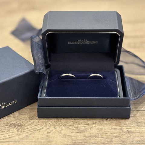 シンプルなデザインで身につけやすいです。 男性の指輪は艶消し加工も選択でき、キラキラしすぎず普段使いしやすいです。 女性の指輪は細かいダイヤモンドが2列に並んでおり輝きが綺麗です。 ひねりのあるデザインは共に歩んでいく2人の道をイメージしているそうです。