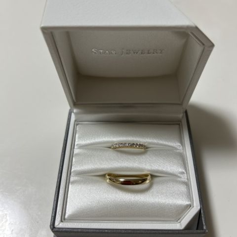 シンプルで綺麗めなデザインで付け心地が最高です。 指輪がS字になっており細身なので、指輪を付けたときに手が綺麗に見えるのもポイントのような気がします! 内側には入籍日.絵文字も刻印して頂きました! 特別な指輪です!