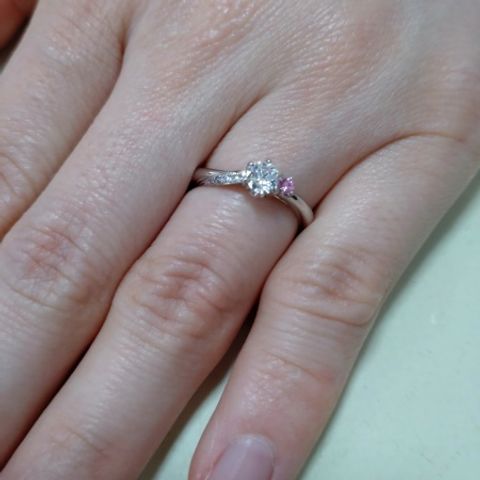 センターダイヤモンドだけでなく、左右にもダイヤモンドがありとても見栄えがいいです! 流れるようなラインは指輪を正面から見ても綺麗です! また、サブのダイヤモンドをピンクサファイアに変更しました。 可愛らしくなりオリジナリティも出ていい感じになりました!