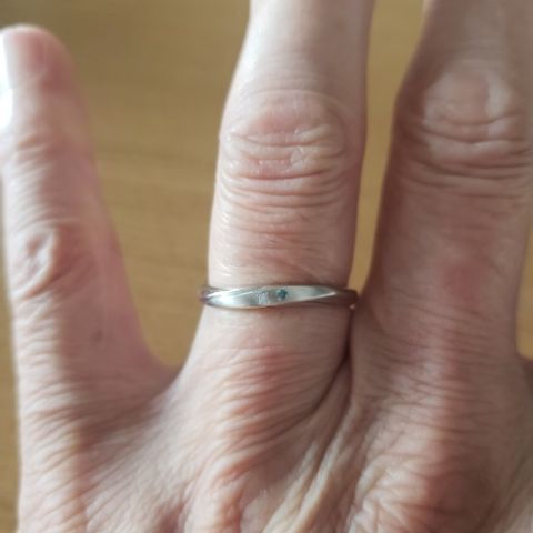 シンプルで飽きないデザイン S字のラインとセンター部をマッド使用に加工、さらにブルーダイヤとダイヤを取り付けオリジナル感を出しました。 太さもちょうど良く自分の指にあうものがあってよかったです。 着けた感じも違和感ありません
