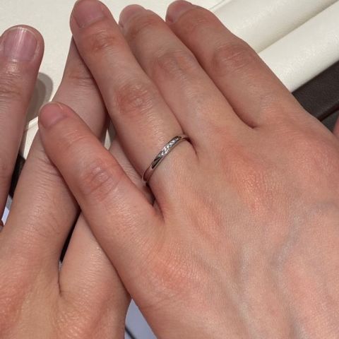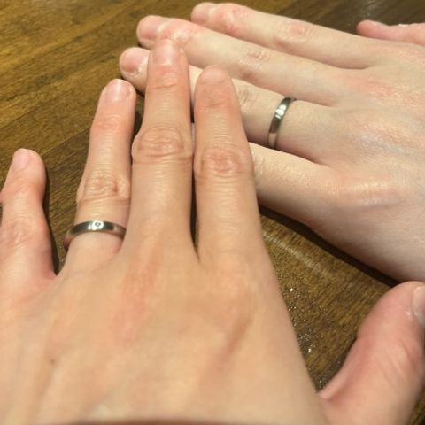 夫婦それぞれの好みのデザインを詰め込んだ指輪を作って頂きました。 シンプルかつ繊細なデザインに仕上がり、 とても満足いく指輪になりました。 ダイヤモンドもアクセントになり、 光り方もまた違って見えるので、それぞれ特徴がある指輪となりました。