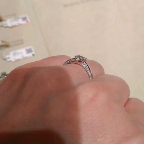 キラキラしたタイプに憧れがあったのですが、あまりギラつくのも嫌でサイドにメレダイヤがついたデザインにしました。 また普段遣いしやすいように、いわゆるエンゲージメントリングのようなカットのダイヤではなく、アショカカットが素敵だなと思いました。またあまりダイヤが飛び出ていないデザインが良く、ひっかかりもしにくいので使いやすいです。