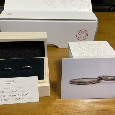 ゴールドとシルバーで木目調を表現しピンクゴールドが一筋入った珍しいデザインで気に入りました 今回はいぶし仕上げにしたので少し黒っぽい格好いい仕上がりになっています 妻が金属アレルギーなので内側はプラチナで亜鉛は抜きで製作して頂きました キャンペーンにて私はアイスブルーダイヤモンドと妻はクリアダイヤモンドを内石に入れて頂けました 外側にもダイヤモンドが入れれるのですがシンプルなデザインが良かったのでそれは無しにしました シンプルでもこだわりを出せて唯一無二のデザインに仕上げることが出来るのがこの指輪の良い所だと思います
