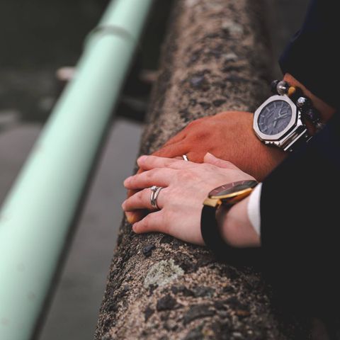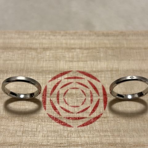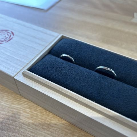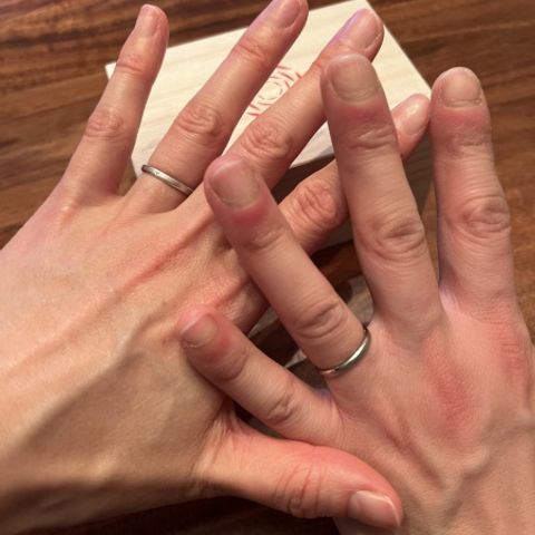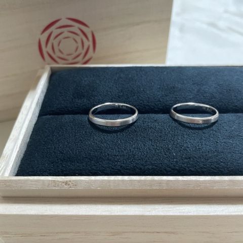 男性用: ストレート/平甲丸/3.5mm幅/鏡面仕上げ/表シンプル/手のひら側に動物のレーザー刻印 女性用: ストレート/平打ち/2.5mm幅/鏡面仕上げ/(ほんの少し)角丸加工/ダイヤ3石デザイン(それぞれ別のお部屋に埋込) 鍛造製法によって鍛えられたプラチナは、開けて瞬間見てすぐ分かる重厚感と輝きでした! 実際手に取ると見た目よりもずっしりしていて、頑丈さと質の高さを実感しました。 男性用は、手の甲側は鏡面仕上げデザインなしでとことんシンプルに地金の美しさ生かし、手のひら側にレーザー刻印を入れることで両面楽しめるのがポイントです。 女性用は、ダイヤが7色に輝いていて手元を見るたびにうっとりしてしまうくらい綺麗ですが、別のお部屋にしっかりと埋め込んであるので光りすぎず上品な輝きです。 スタイリッシュな印象にしたかったので平打ちを選びましたが、少し角が痛かったので、ほんの少し角丸加工を入れてもらうことで全く気にならなくなりました!