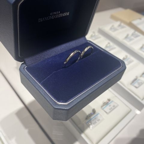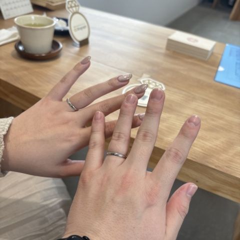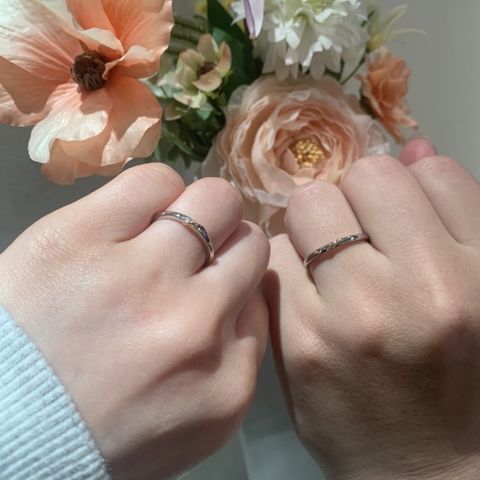 中央の小さなダイヤモンドや表面加工など、シンプルではありますが他ではあまり見ないデザインに、2人ともすぐに気に入りました! また、着けた時に違和感のない、肌なじみの良い幅になっているところも、選ぶ上でポイントになりました。