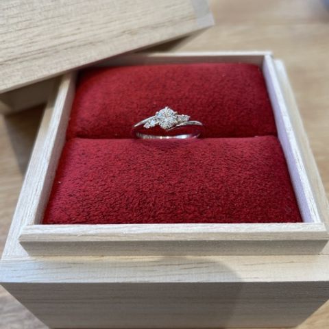 プロポーズをしてもらったとき、ダイヤモンドだけもらい後日店舗の方でリングのデザインを決めにいきました。結婚指輪と重ね付けしたかったので重ね付けできるようなデザインを担当の方と相談しながら決めました。実物の見本を見ながら決めました。