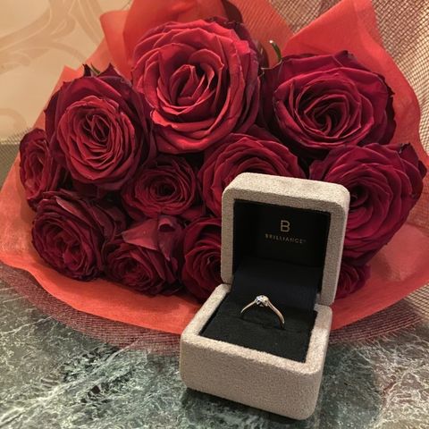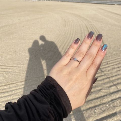 婚約指輪でソリティアの4本爪のプリズムを贈って頂きました。流行り廃りのないシンプルでありながらダイアモンドが映える本当に美しく素敵なデザインです。手が大きめな私でも女性らしく柔らかな印象を持たせてくれます。