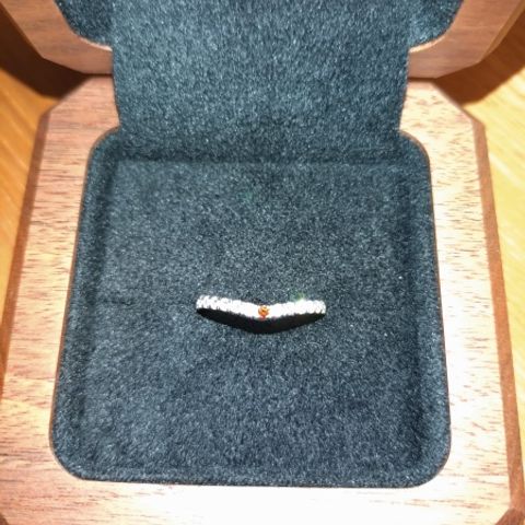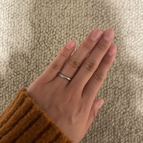 派手すぎず、シンプルすぎないダイヤの量とデザインが気に入りました。ウェーブしてるデザインが良かったのでそれも選んだポイントです。他店の同じようなデザインも見ましたが、ダイヤのつき方がより自然で綺麗だと感じました。