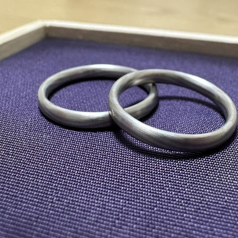 デザインは「風結」を選びました。2人ともどんな服装にも似合うシンプルな素材が良くて決めました。加工は「風結」のくぼみの部分をホーニング加工にしくぼみを強調したデザインにしました。また、日が経つにつれて加工の様子も変わっていくとの事だったのでそこも2人で楽しめたらと思いこの加工を選びました。 2人とも仕事上、手が荒れる作業もあるためダメージがはいりにくいプラチナにしました。