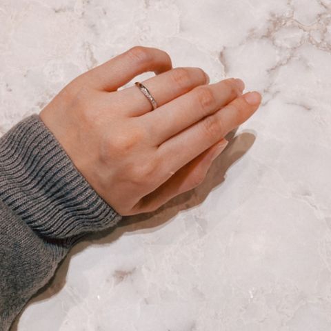 私自身指が短く指輪が似合わないと感じていましたが、今回選んだ風結の指輪はダイヤが斜めに入っていて指がすらっと長く見え、とても気に入りました。また、全面ではなく一部にダイヤが入っているので、長く使えると思いました。