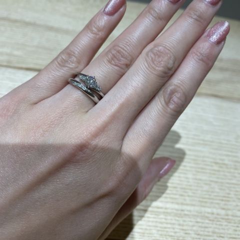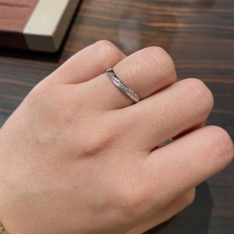 あまり見ない曲線のデザインが気に入って購入しました。指が細いので華奢なデザインがぴったりハマりました。婚約指輪と結婚指輪をセットでつけた時のダイヤの部分のつながりもとても綺麗で気に入っています。他に試着した指輪の中で一番付け心地が良かったのでこちらに決めました。