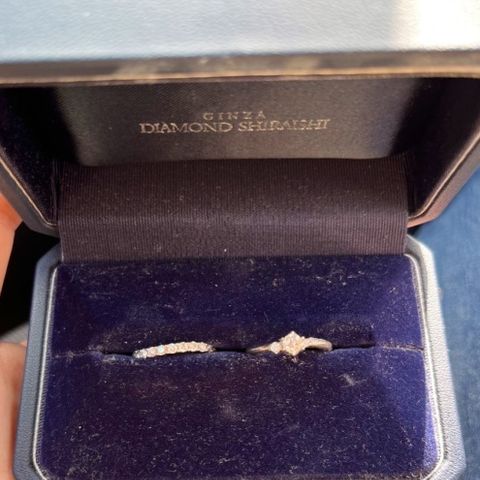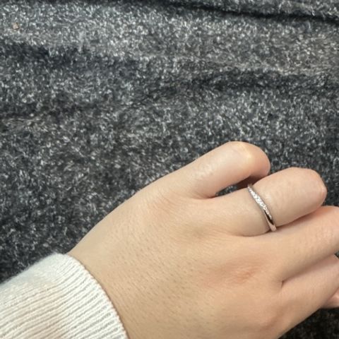 半周ダイヤモンドが光り輝いており、お気に入りです。 指が細いため、華奢なリングにダイヤモンドがウェーブを描くようなデザインに一目惚れしました。 また主人と同じデザインの指輪をつけているペアリングがお気に入りです。