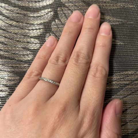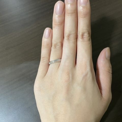 ゴージャス過ぎず、あまり人と被らないデザインがとても気に入っています。指輪の半分にダイヤモンドが施されているので、シンプルに使いたい時はくるっと回して使っています。また着け心地もとても滑らかで、金属アレルギーに対応したプラチナのものを選びました。