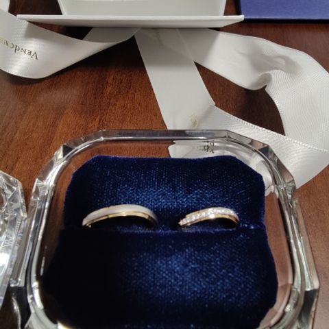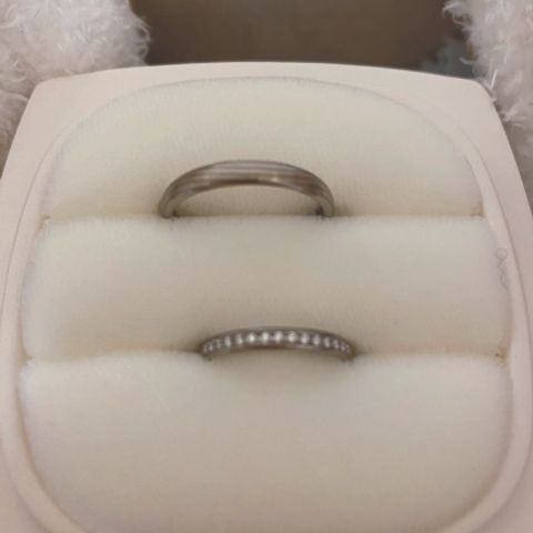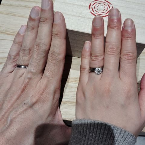 着け心地が非常に良い。外した時に見れる裏側のダイヤモンドも意味が込められていて非常にお気に入りです。妻の指輪は、ダイヤが入ったエレガントな仕上がりを選び、私はシンプルかつ今後も飽きがこないようなデザインを選びました。