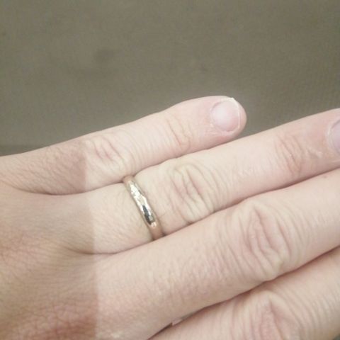 凸凹した質感はまさに指輪のタイトルの「道」にピッタリな印象です。結婚生活の道のりは平坦な道ばかりではなく、凸凹した道だからこそ、嬉しいことや楽しいことがより一層感じることができるのだと思います。これからも一日一日を大事に、妻とも、この指輪とも歩んでいけると自信になります。それぐらい自分にはピッタリな指輪だと思います。