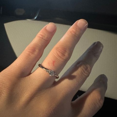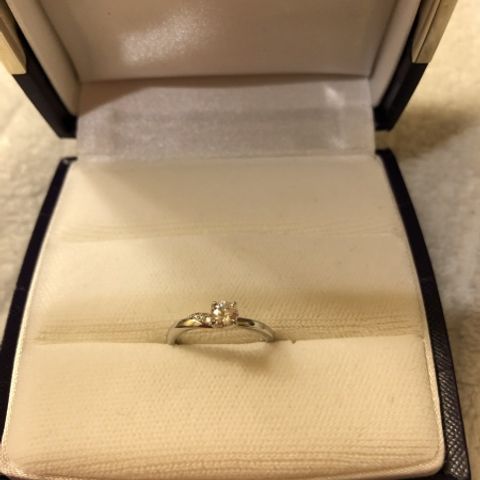 シンプルで上品な指輪です。メインの大きいダイヤモンドの隣に2つ小さなダイヤモンドがあり、シンプルですが可愛らしい印象になります。指輪は少しV字のような形なのでナチュラルに指が綺麗に見えるような気がします。