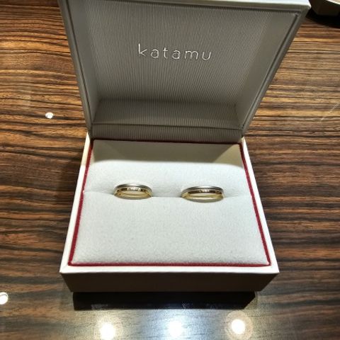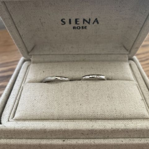 フルオーダーメイドで二人だけのリングを作ることができました。気に入った槌目加工とミル加工で作ってもらいました。色も2色選び、サンプルリングがなかったので受け取るまですごく楽しみで、手元にリングがきたとき、想像以上に素敵なリングで嬉しかったです。