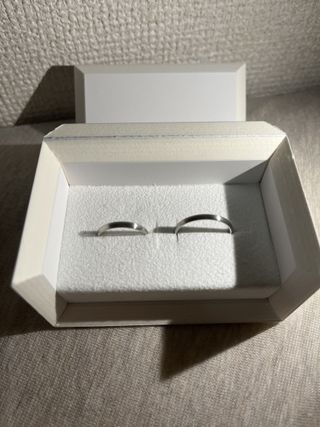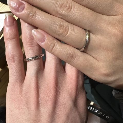 着け心地の良さとシンプルだけど被らないものという視点で選びました。デザイン数も多く、いくつも着けてみた中でお気に入りに出会えました。シンプルなデザインを選んだため、ちょっとしたお出かけにも使いやすそうです。比較的どの結婚指輪とも重ね付けの相性が良いと思います。