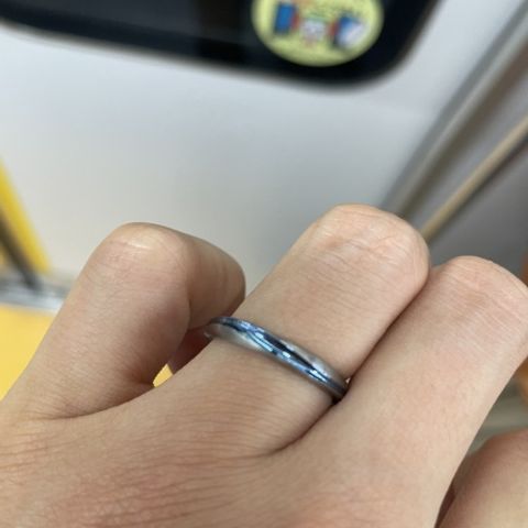 ストレートで平打ちの指輪を探していたのでイメージにぴったりでした。ダイヤが一粒で入っているのは好みではなかったので、長方形の形で入っているところも気に入りました。シルバーっぽさもあるので無骨な夫の指にも似合います。