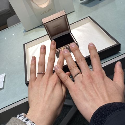 同じブランドですが、新婦の指輪はキラキラで新郎の指輪はマットのものを選びました。お互い好みのものがお揃いでつけられてます! また、形も指が細見えしてオシャレだなと思っています!永く大切に身につけたいと思います。