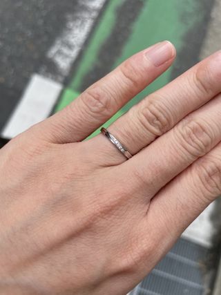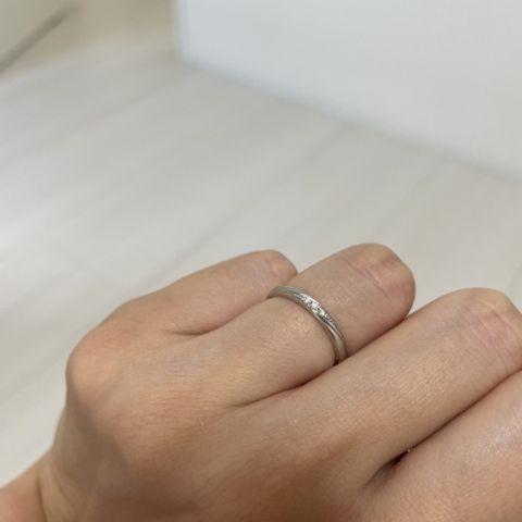 指が細長く見えるデザインで着け心地も良く、とても気に入っています。似たようなデザインが沢山ある中で、こちらの指輪は、指輪選びで1番最初に試着した時からずっと忘れられず他に沢山試着しましたが、最終的に購入した指輪です。