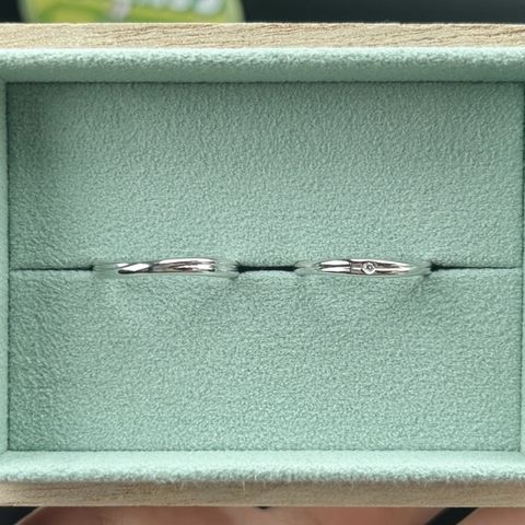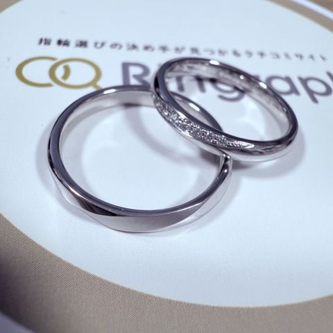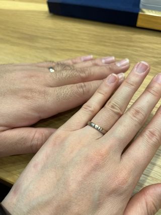 着け心地が良く、指にフィットしています。 価格帯も高すぎず、デザインもシンプルかつオシャレなものです。 婚約指輪と重ねたときも、両方が輝いて見えます。 男性側もマット加工をしており、オリジナル感のある指輪になりました。